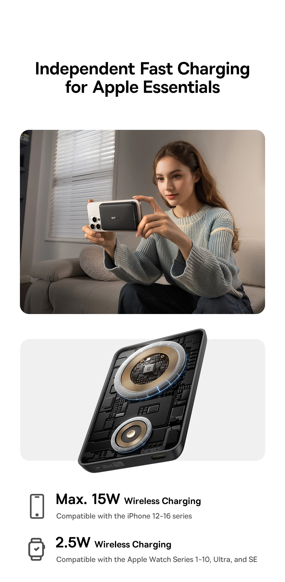 Precisely auto-align for your iPhone or for Apple Watch for stable charging.