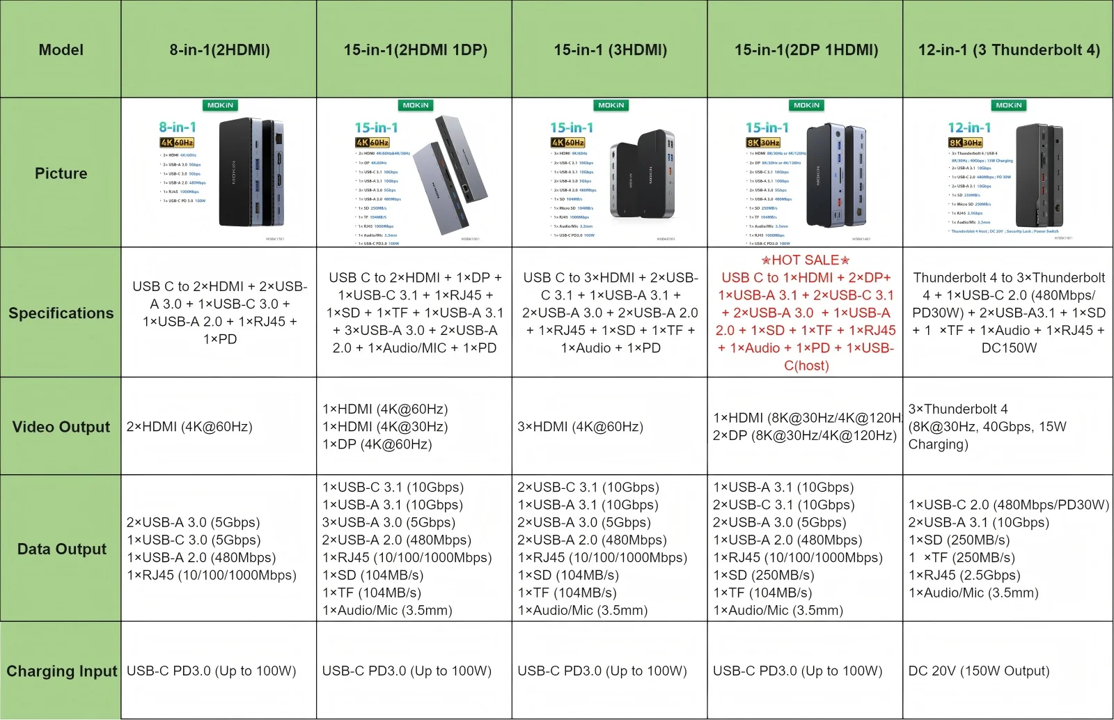 (3)15-in-1 (3HDMI): USB C to 3×HDMI + 2×USB-C 3.1 + 1×USB-A 3.1 + 2×USB-A 3.0 + 2×USB-A 2.0 + 1×RJ45 + 1×SD + 1×TF + 1×Audio + 1×PD